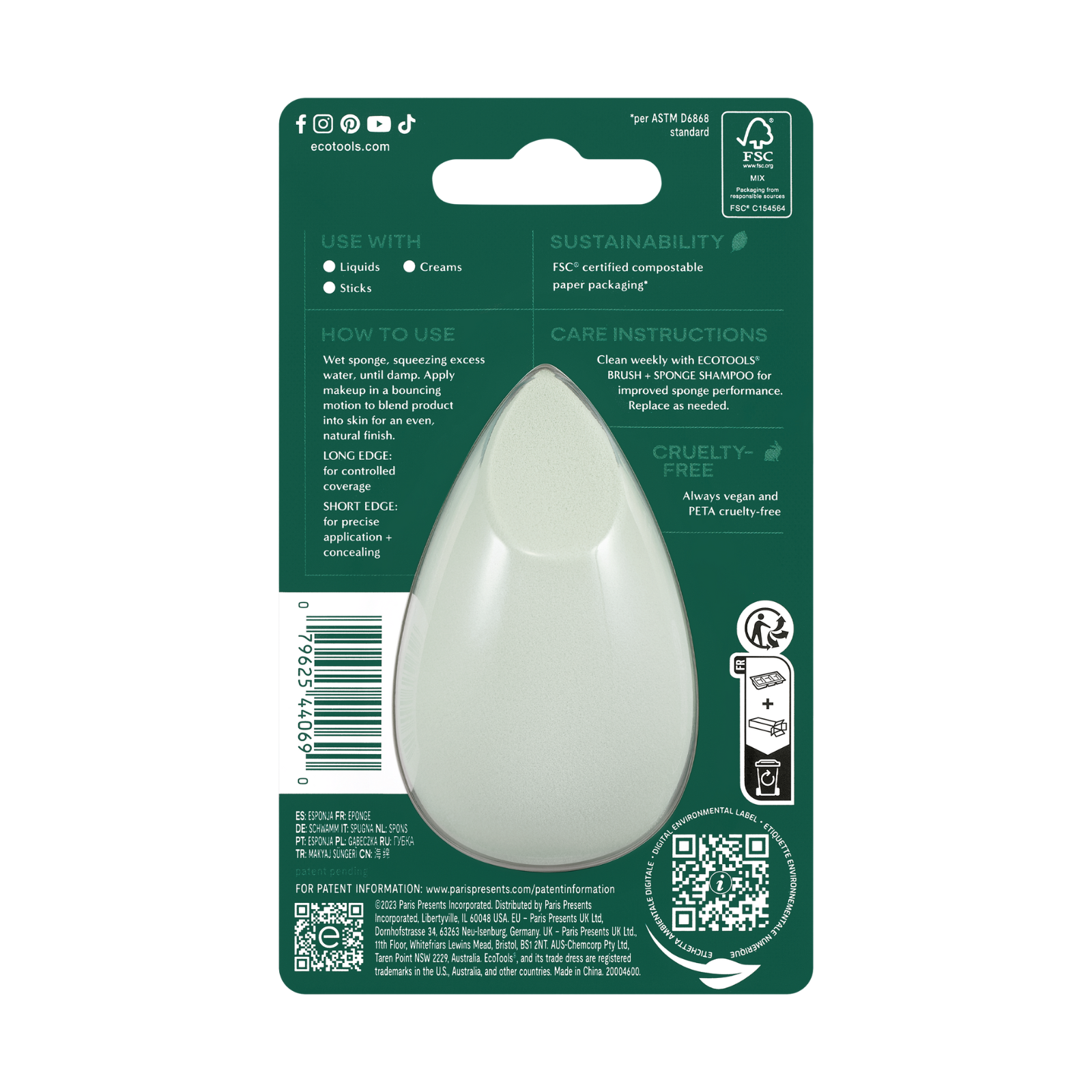 The EcoTools Blurring Blender Makeup Sponge features an ultra-soft, bouncy foam that reduces makeup absorbency for buildable, even coverage. Our makeup blending sponge works best damp with liquid, cream, and stick foundation formulations for a natural finish. This light and bouncy blender sponge was created with cloud coverage memory foam to absorb less makeup and reduce waste. It also features 2 sides for custom coverage. Use the long edge of the foundation sponge for controlled coverage and the short edge for precise application and concealing. Superior performance made sustainable. As with all our EcoTools products, this makeup blending sponge is 100% cruelty-free, latex-free, and vegan. The Blurring Blender Sponge is easy to clean with our EcoTools Brush + Sponge Shampoo for improved sponge performance.