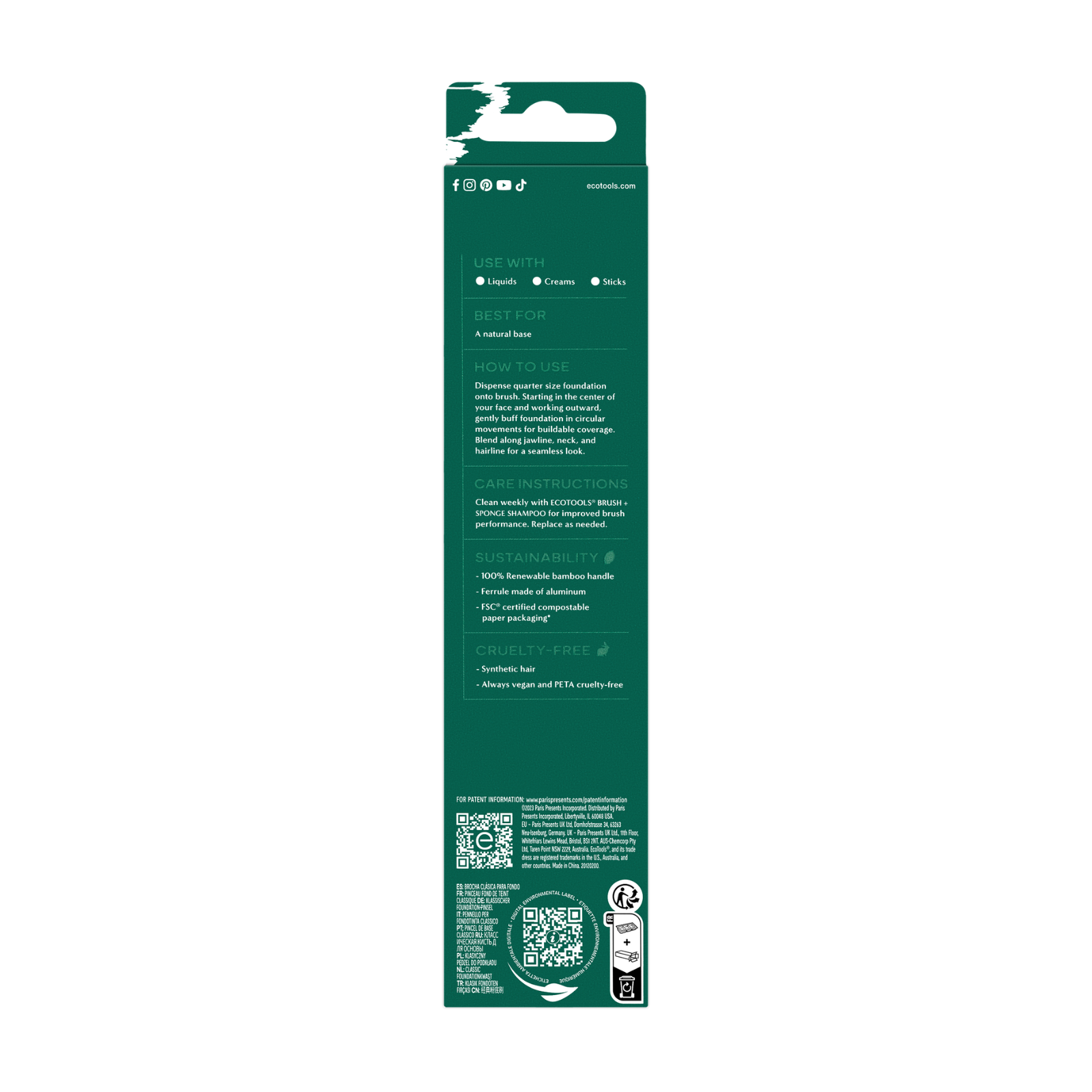 The EcoTools Classic Foundation Brush is our sustainable staple that helps you create a streak-free, natural base. The sloped, dense head is designed for targeted application to blend out your desired coverage. This makeup brush is best used with your favorite liquid, cream, and stick foundation. Gently buff in circular motions using this foundation makeup brush for buildable coverage. Don’t forget to bring the product down your neck for a seamless look. Superior performance made sustainable. This makeup brush is made with 100% bamboo handles, aluminum ferrules, and soft, synthetic brush hair. As with all our EcoTools products, this brush is 100% cruelty-free and vegan. The Classic Foundation Brush is easy to clean with our EcoTools Brush + Sponge Shampoo for improved brush performance.
