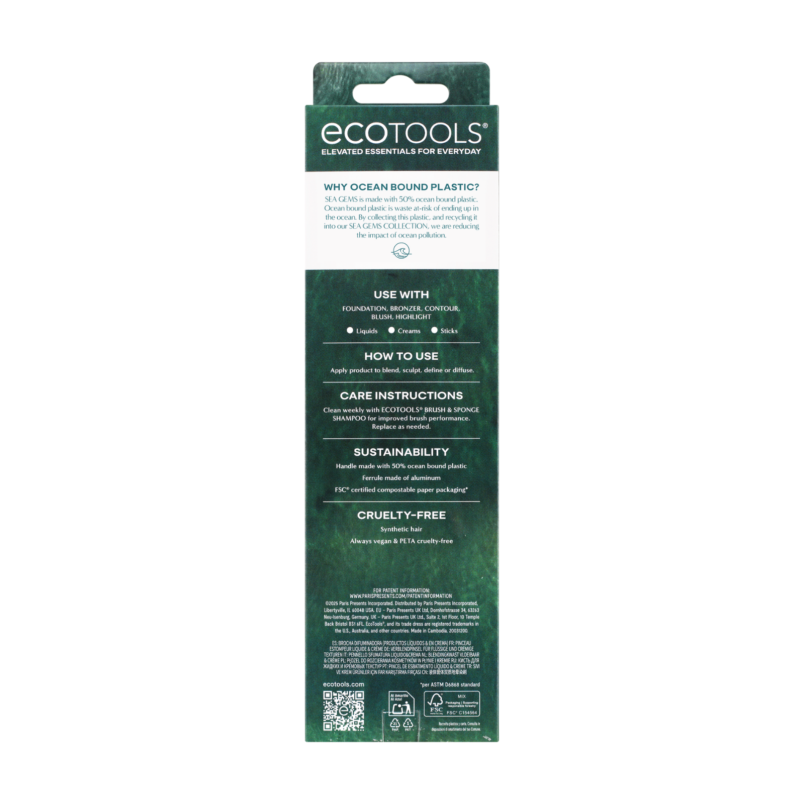 The EcoTools Sea Gems Liquid & Cream Blending Brush is your go-to for building coverage and sculpting with precision. Its compact, dense head is custom-cut to blend liquid, cream or stick products evenly for smooth, seamless definition. Use this multi-tasking brush to apply and diffuse foundation, blush, bronzer, contour or highlighter with control and ease. This makeup brush is part of the Sea Gems Collection and features a handle made with 50% ocean-bound plastic to help reduce ocean pollution. It features lightweight aluminum ferrules and compostable FSC®-certified packaging for a low-waste design that supports conscious beauty routines. EcoTools believes in elevated essentials made consciously and sustainably – always 100% vegan and PETA-certified cruelty-free.
